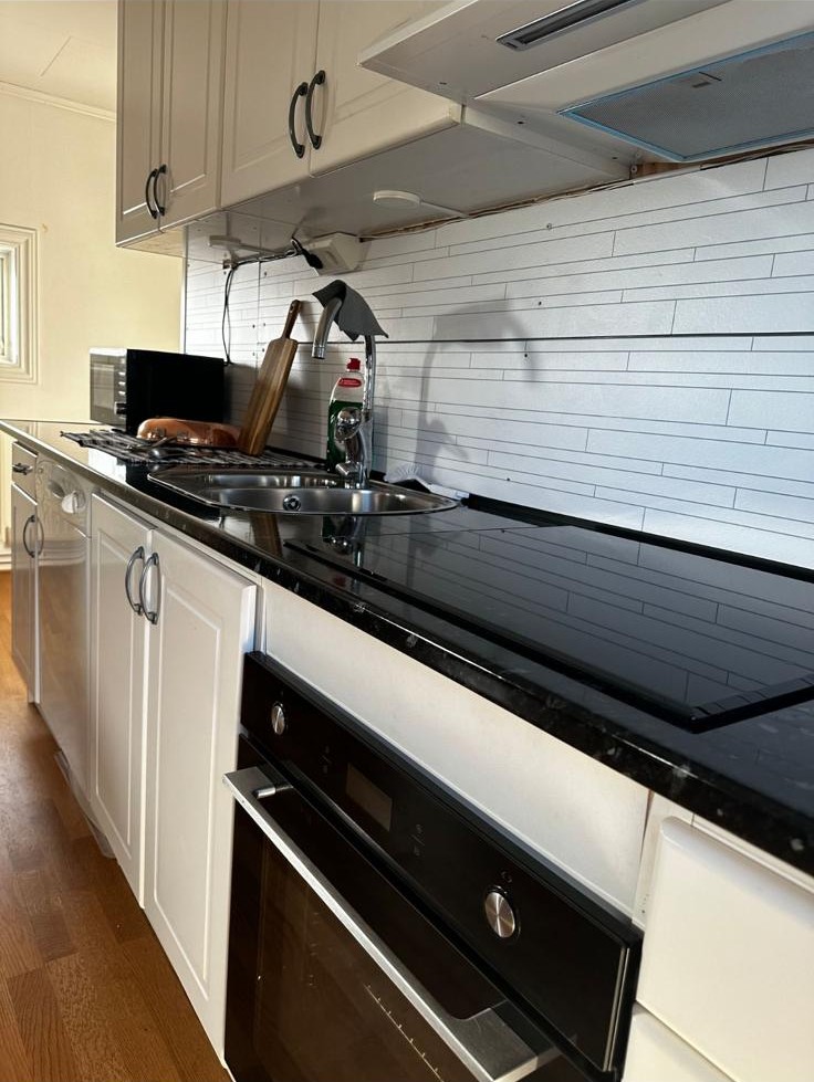 Fully Equipped Kitchen: Featuring sleek white cabinetry, integrated appliances including a dishwasher, oven, induction cooktop, and microwave.
