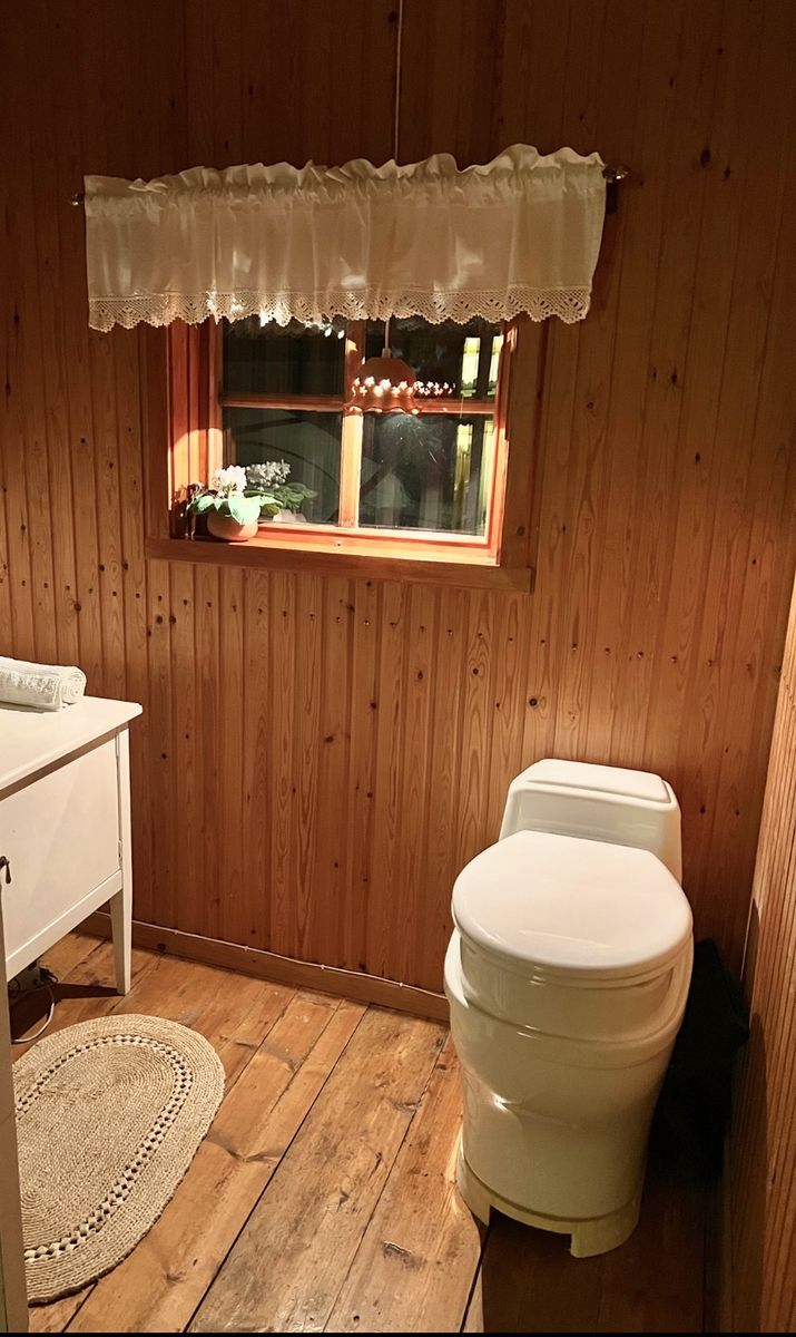 Contains an eco-friendly biological toilet (Separett style) and a sink.