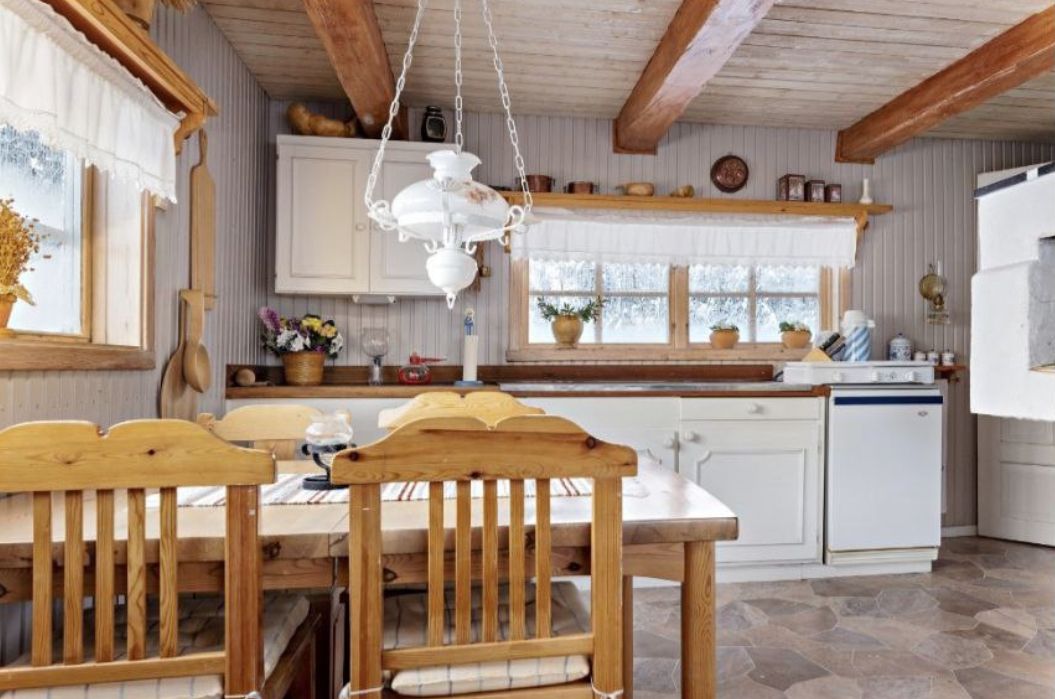 Kitchen: Fully functional country-style kitchen equipped with a stove, oven, refrigerator, and dining seating for four.
