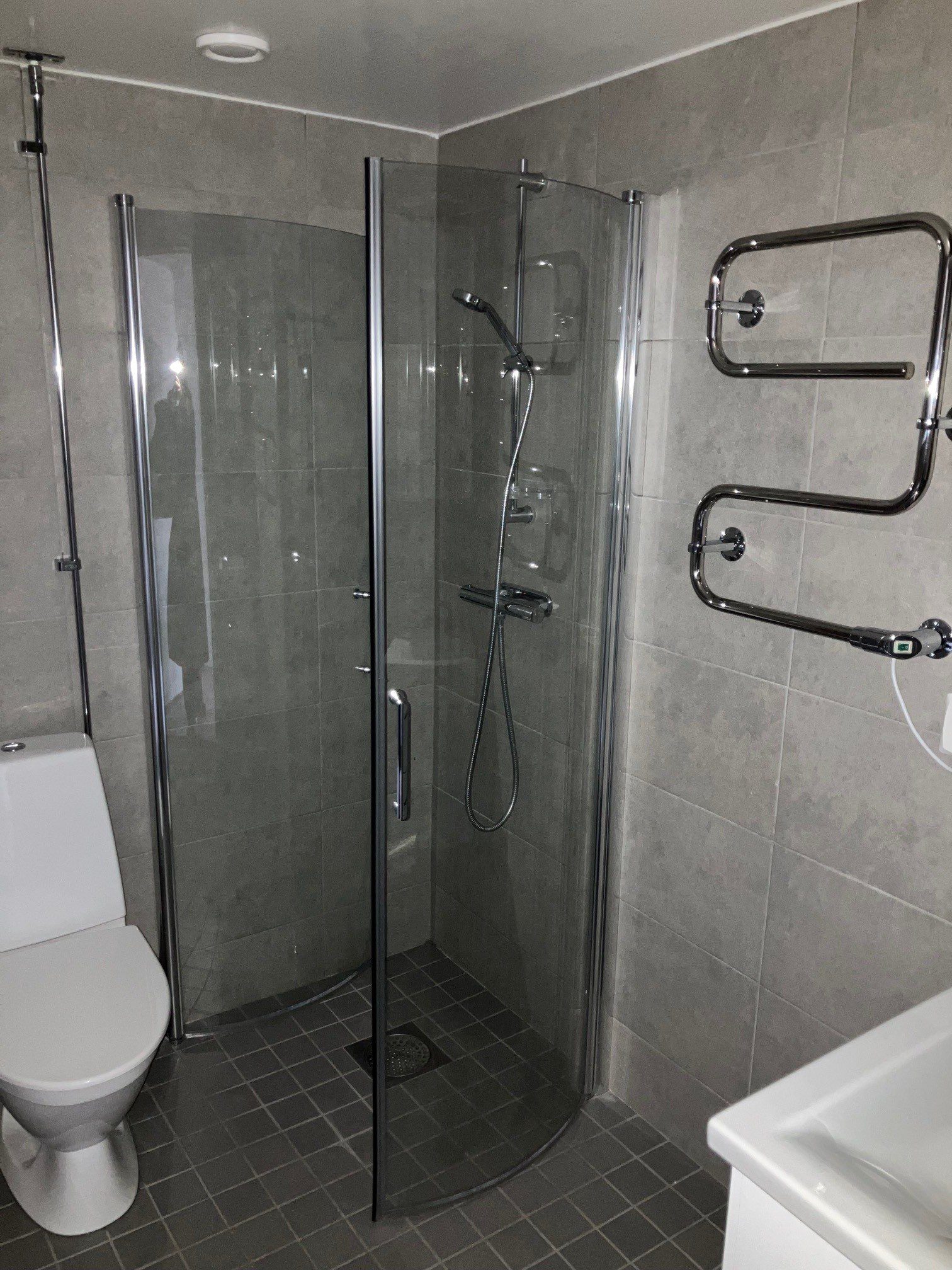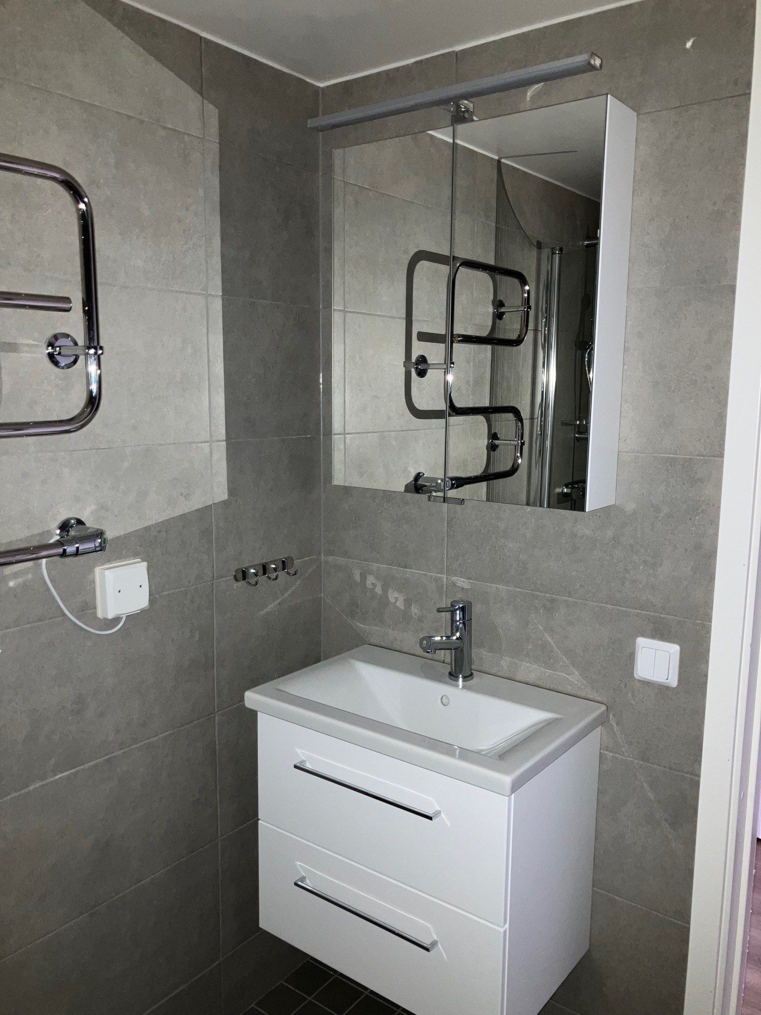 Modern Sanitary Facilities: A fully tiled bathroom with a glass shower enclosure, heated towel rail, and modern vanity unit.