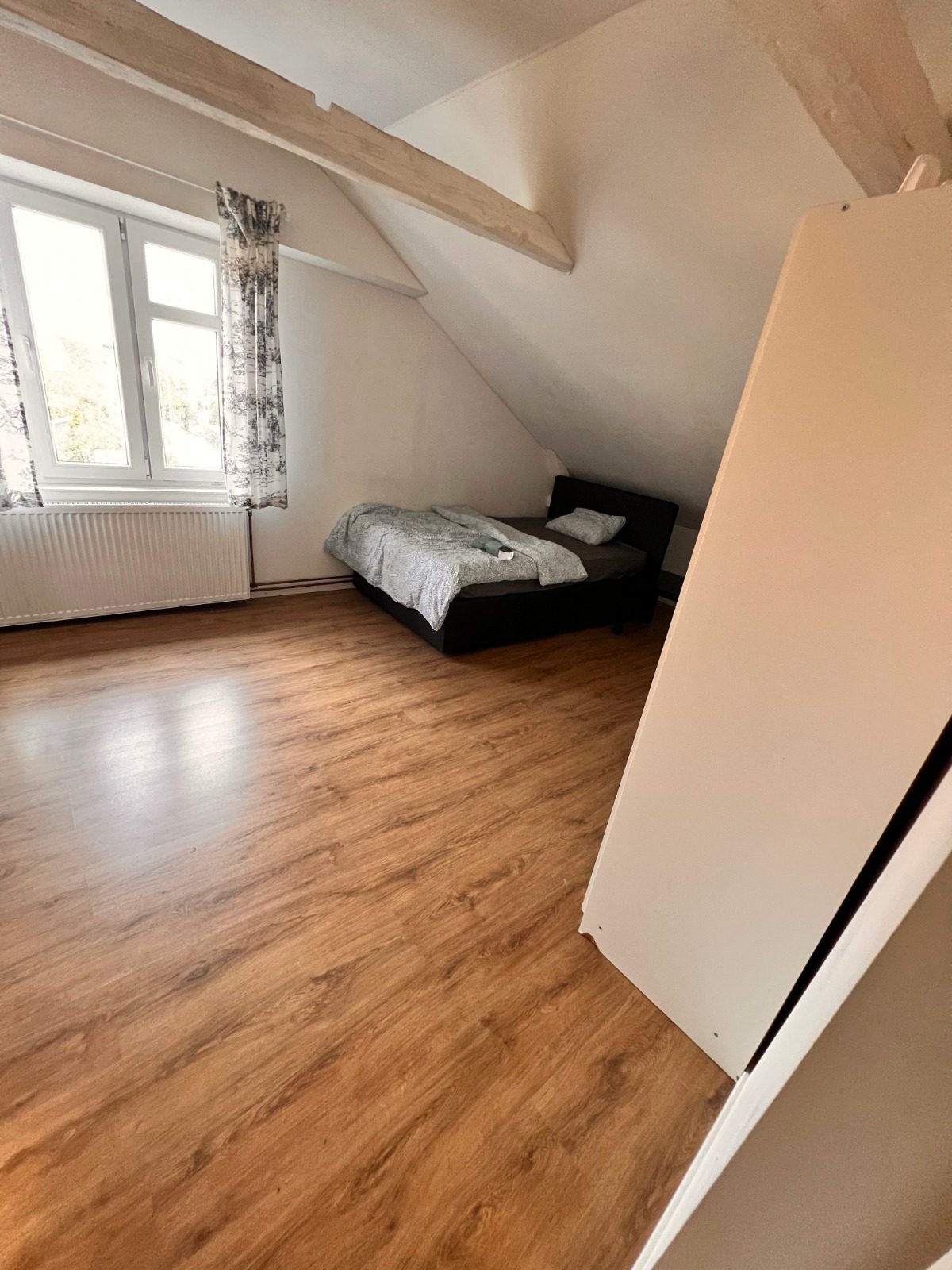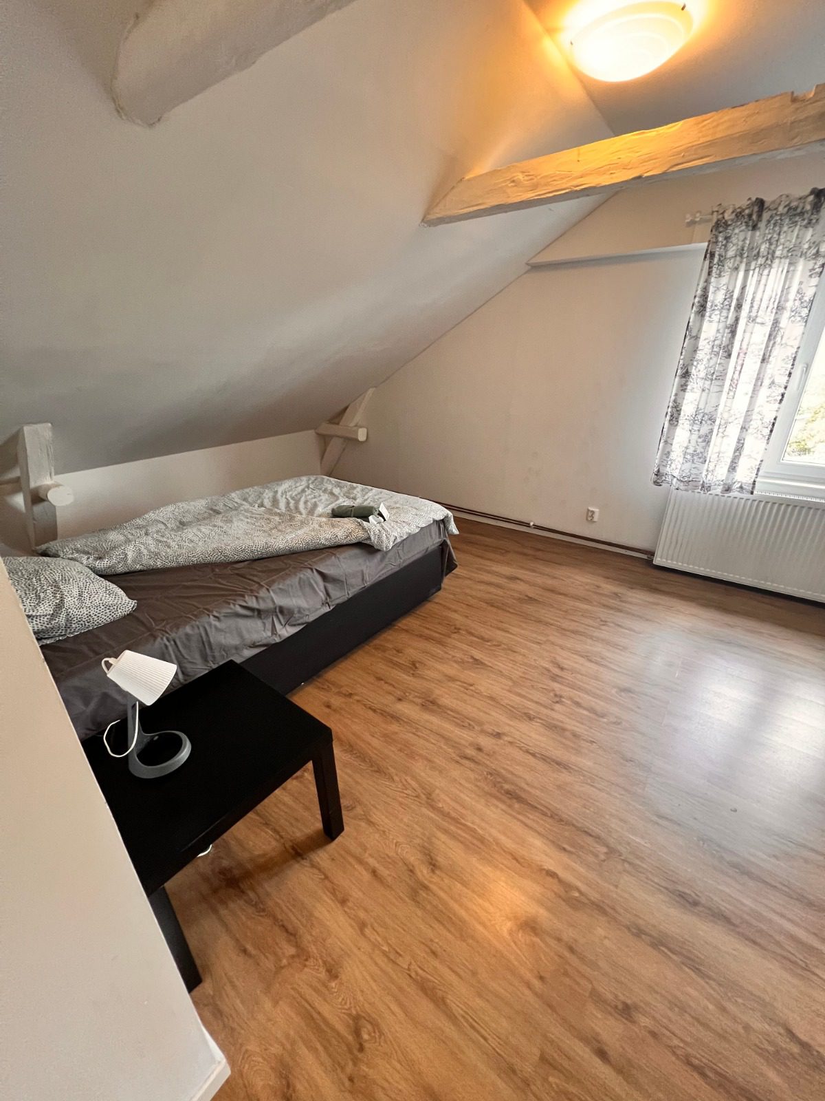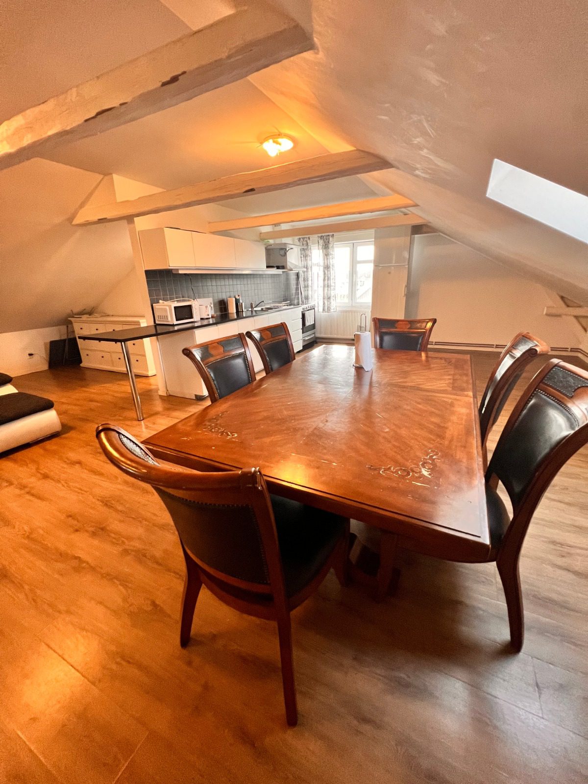 Unique Design: The property features charming white-washed exposed beams and sloped ceilings, offering a unique, bright, and characterful ambiance distinct from standard apartments.
