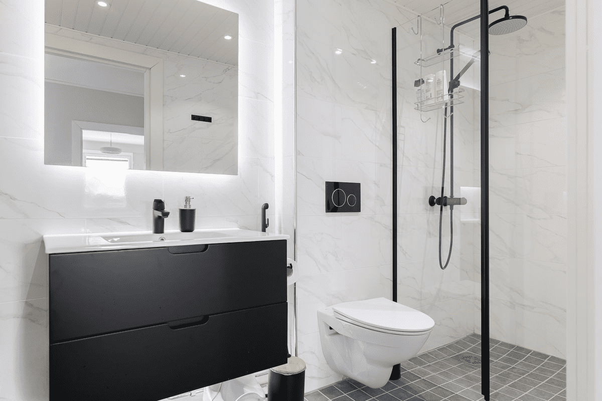 Bathroom 1 (Full): Modernly appointed with a glass-enclosed shower, vanity, and toilet.