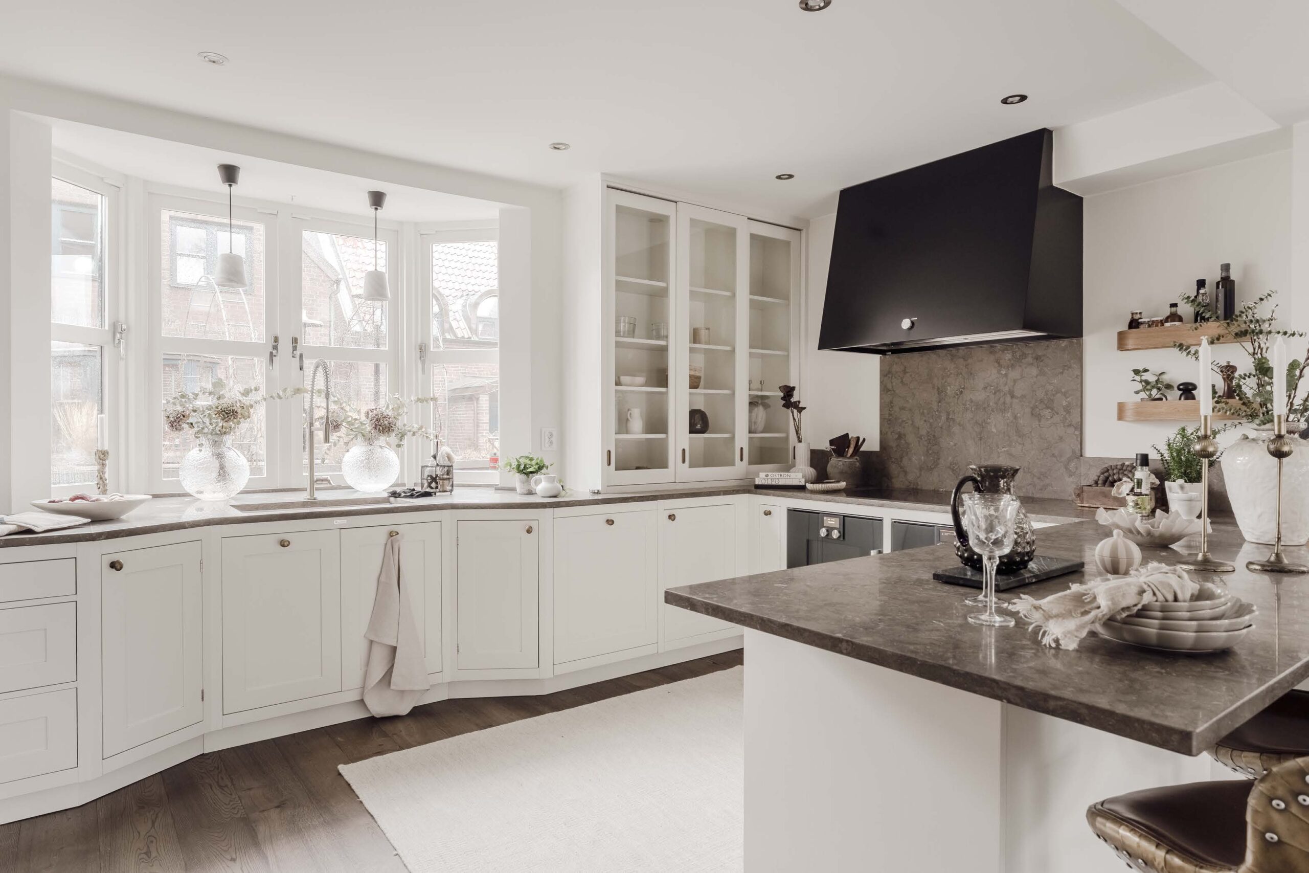 Kitchen The modern kitchen is a culinary highlight, equipped with integrated high-end appliances, ample storage, and a large stone-topped kitchen island. A charming bay window floods the space with natural light, creating an inviting space for morning coffee or casual meals.