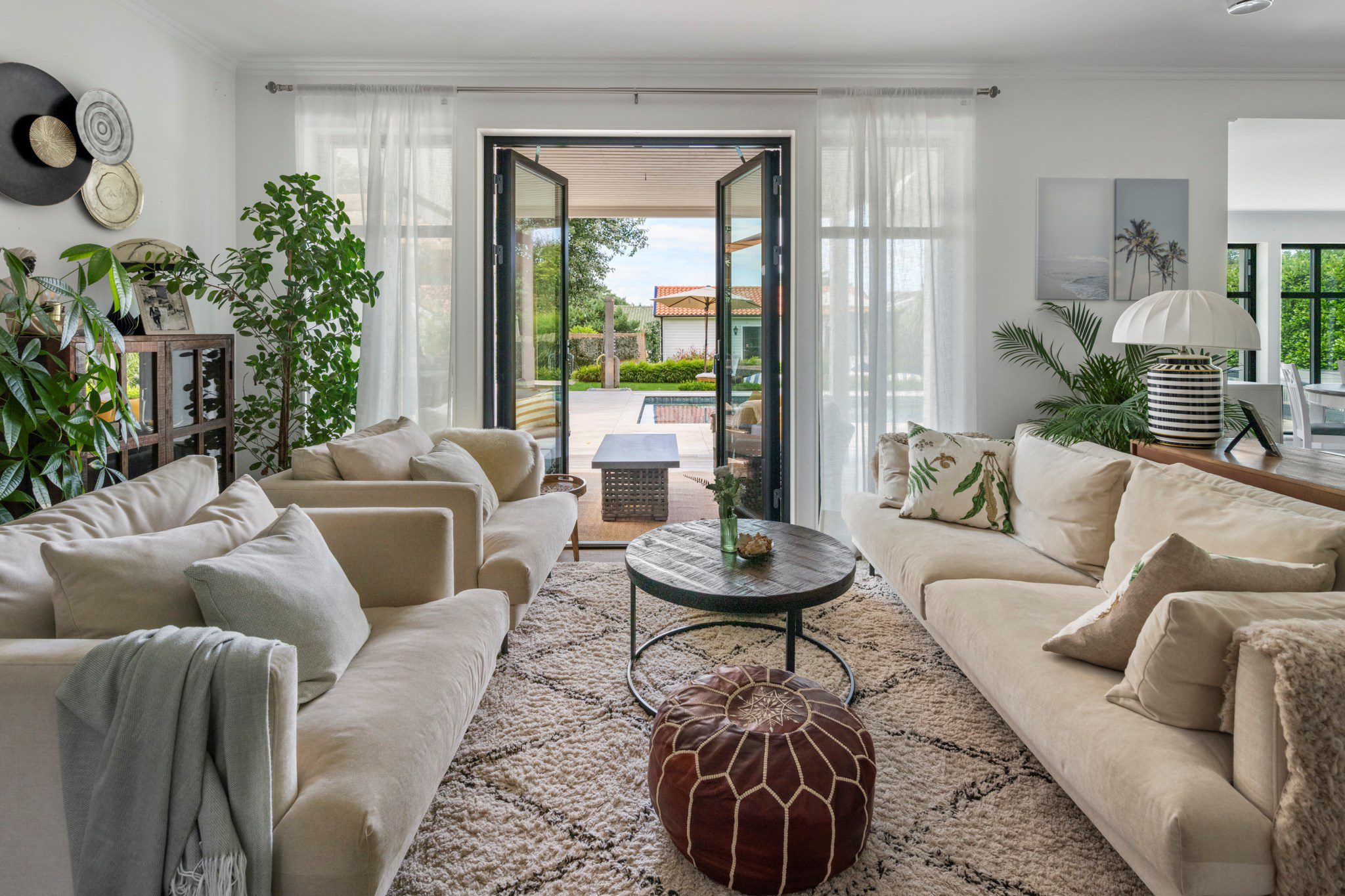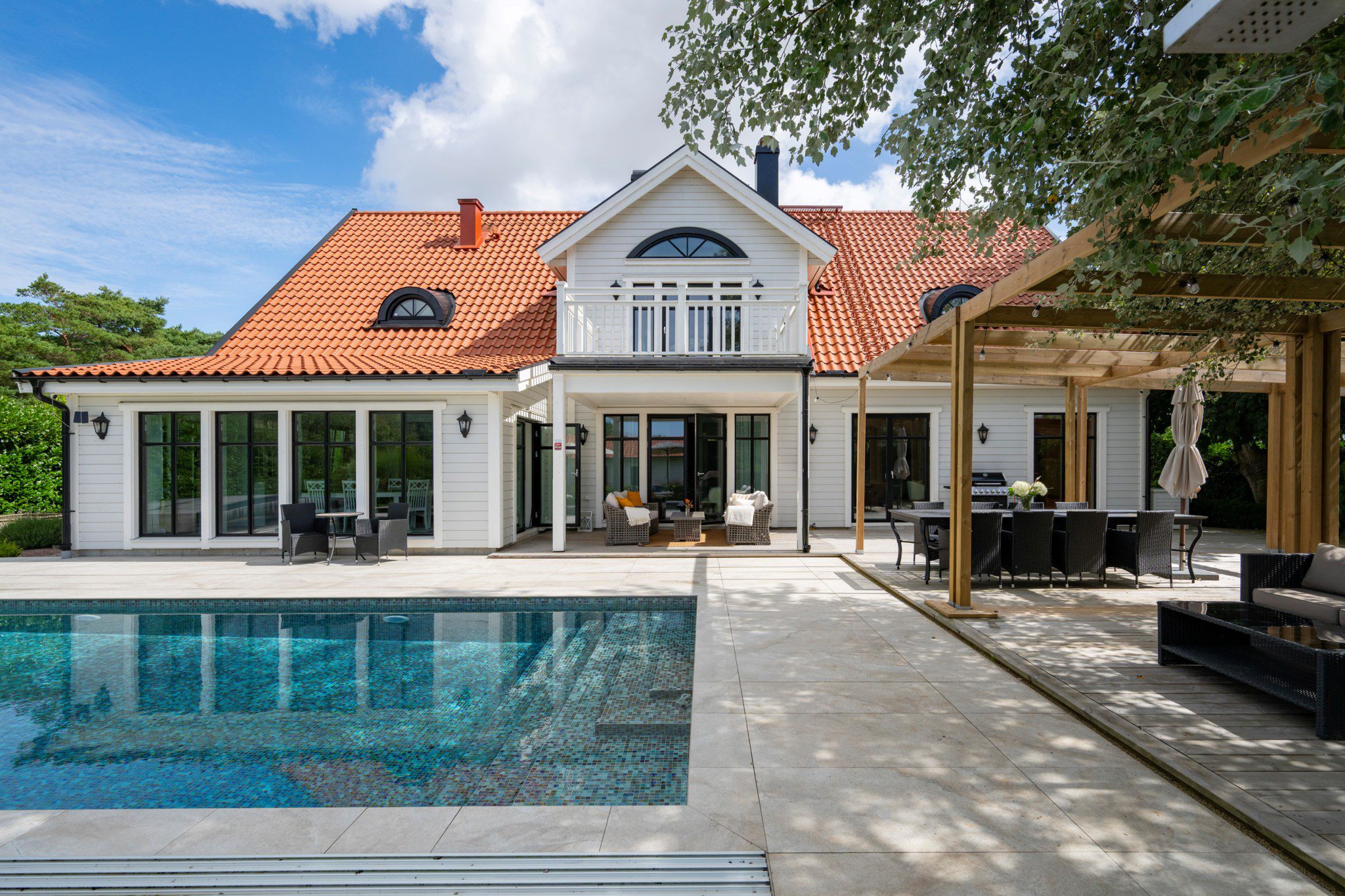The inviting, easy-to-maintain garden includes a pool, pergola, multiple patios, and a generous stone-paved terrace.