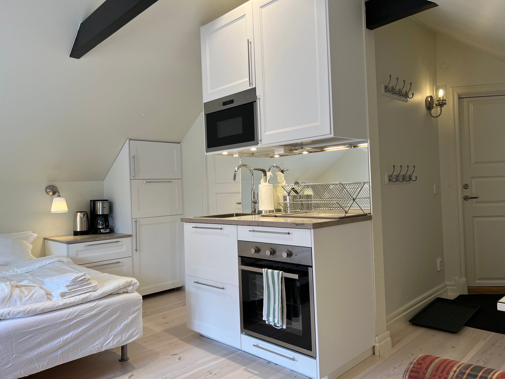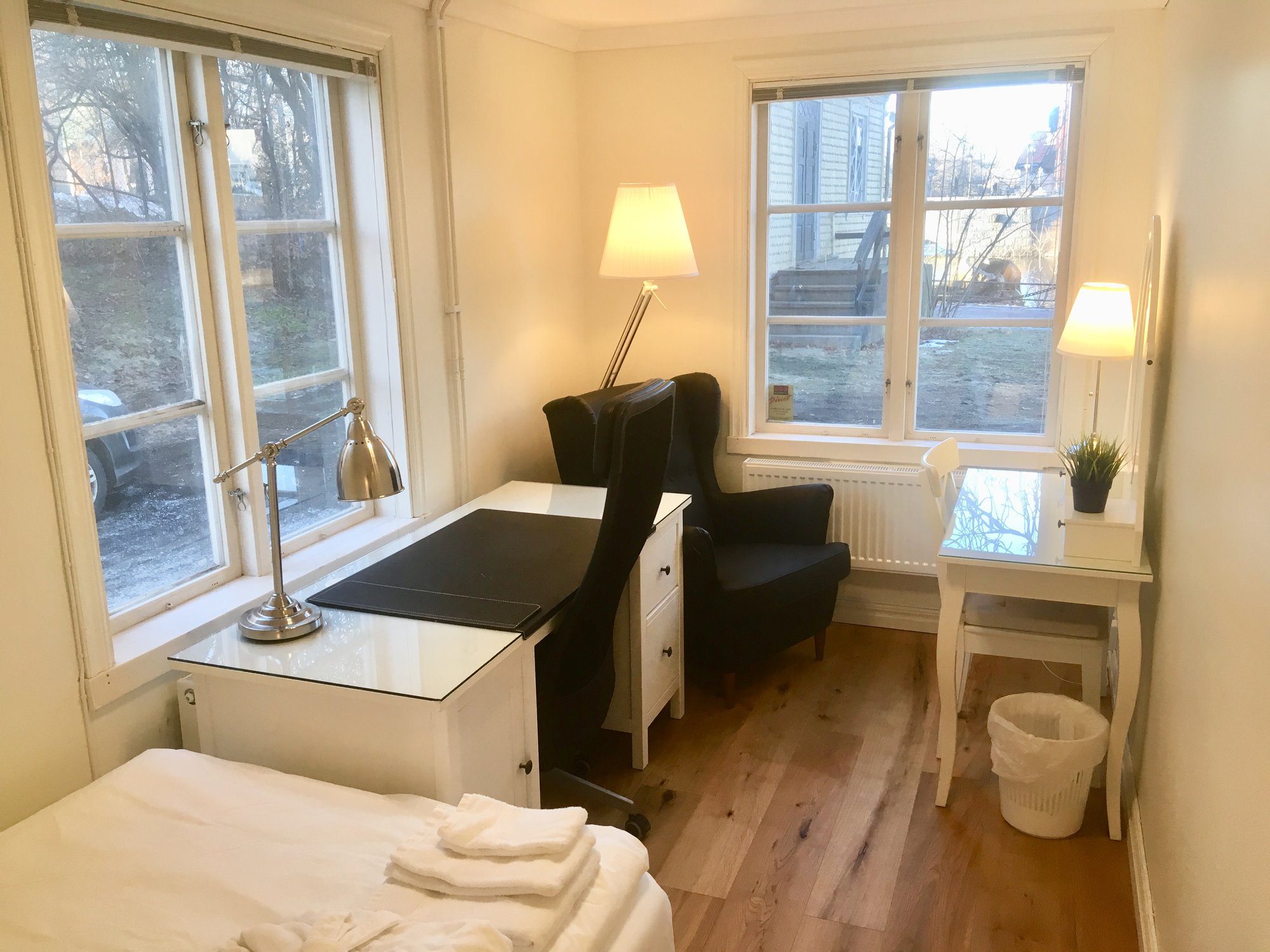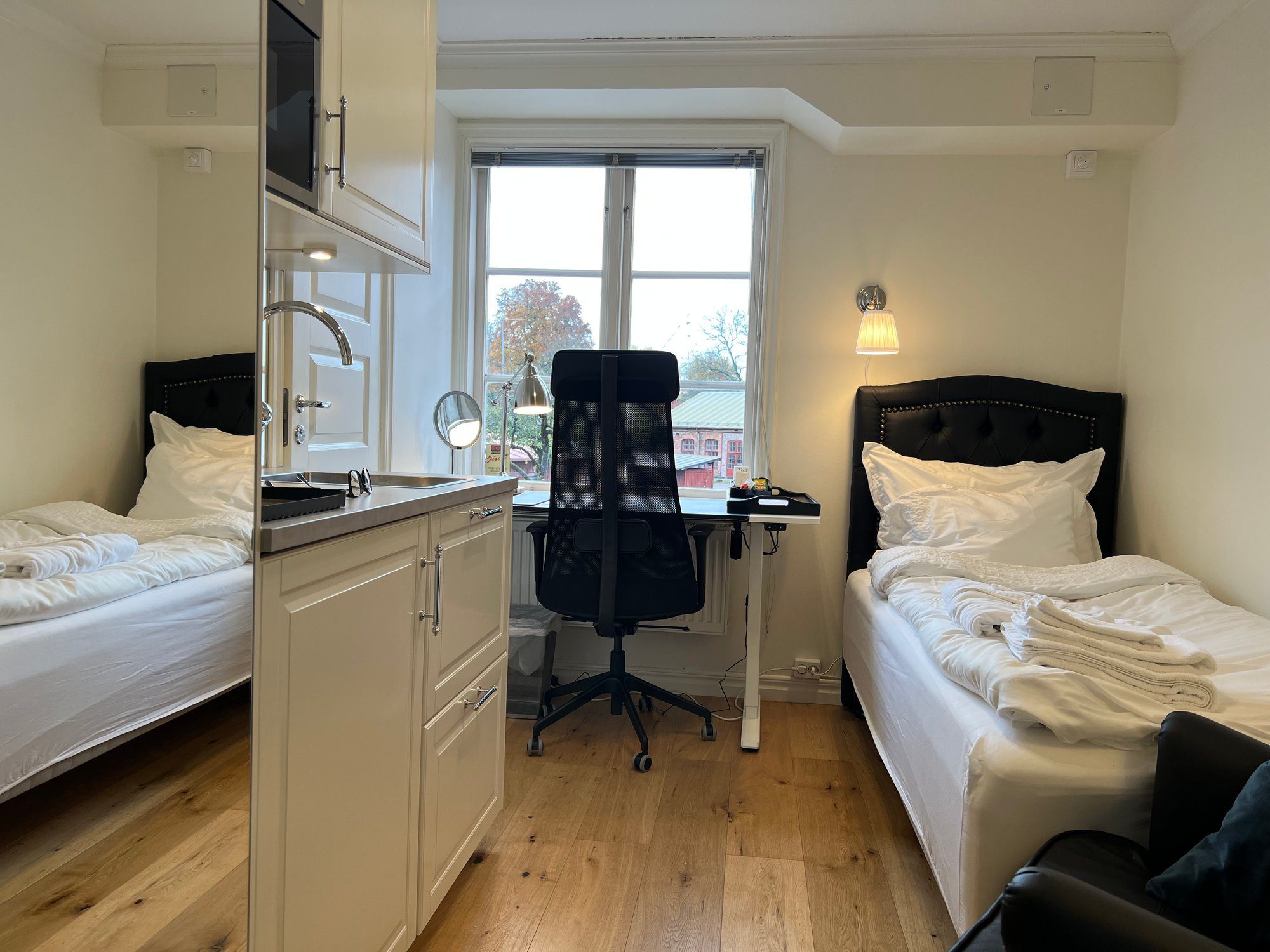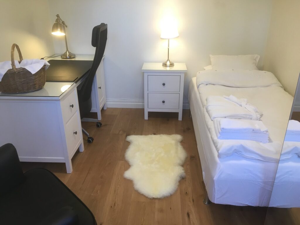The large singles are 18 m² with a shared bathroom and a view of the Nyköping River. Each unit is furnished with a 120 cm bed, workspace, sofa, and wardrobe. Beds come with linens, an extra set, towels, and a bathrobe. Tenants have their own storage in the shared kitchen, including fridge, freezer, and cupboard space, and follow a weekly schedule for kitchen waste.