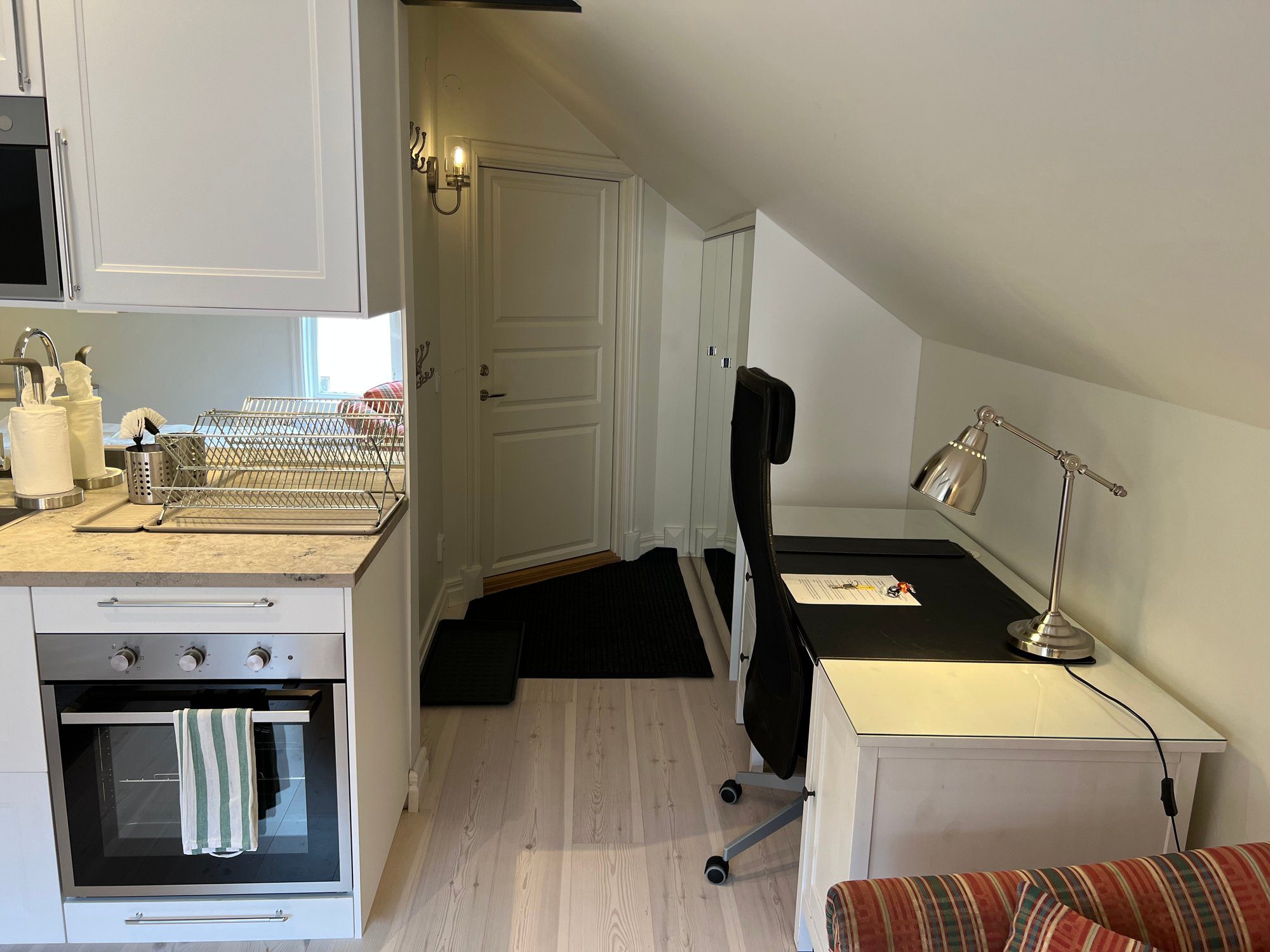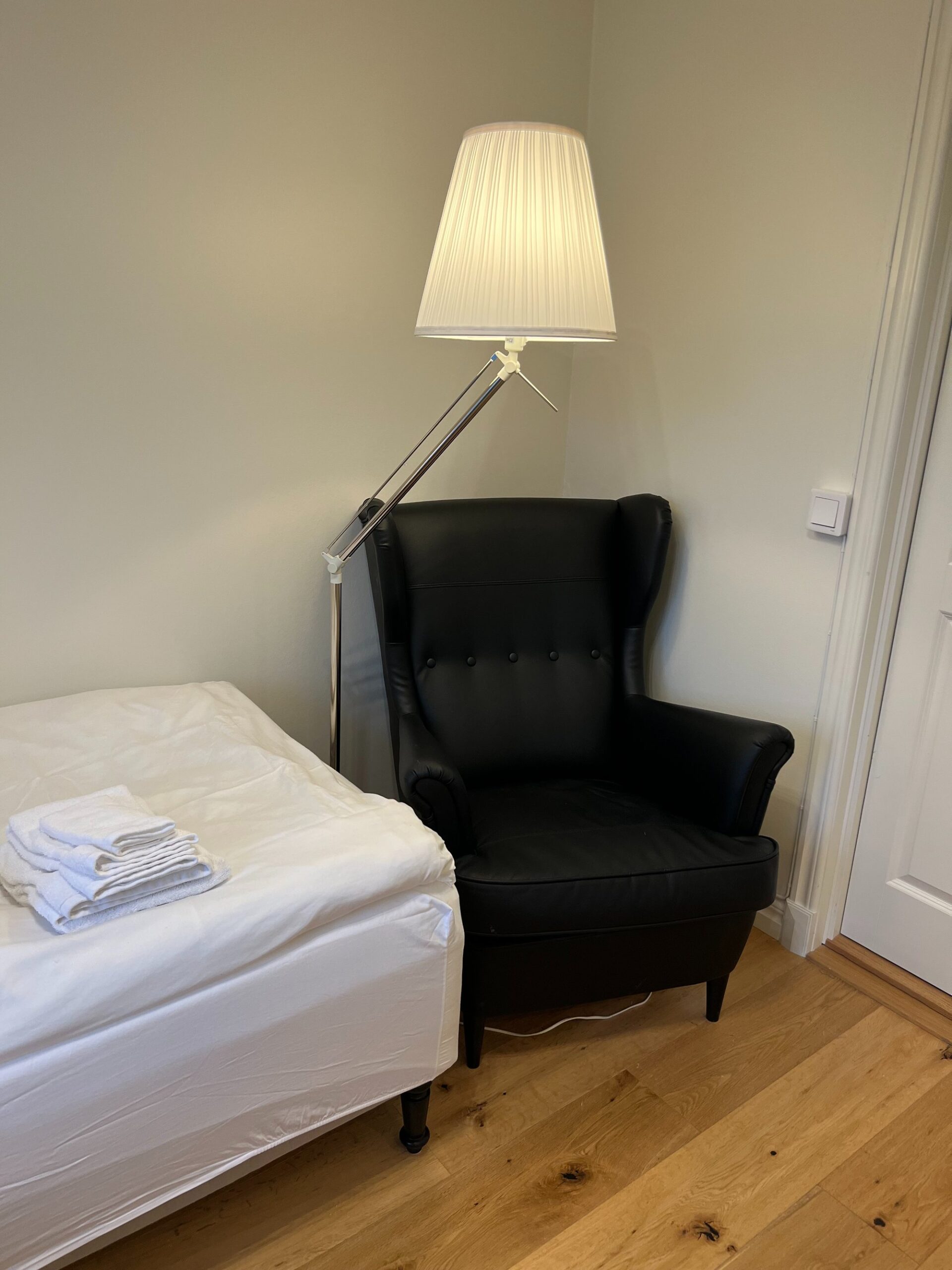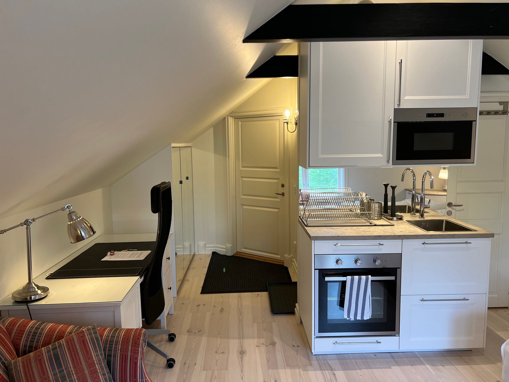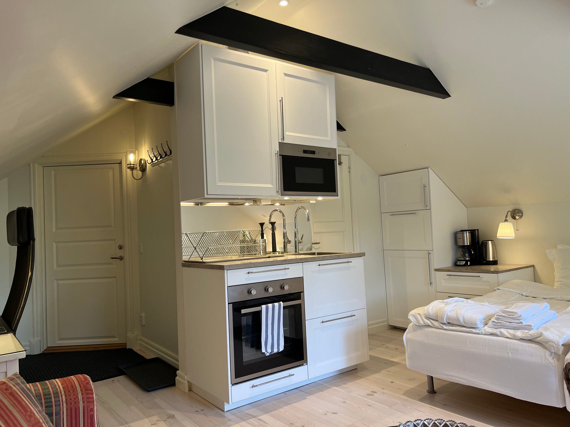 The large singles are 18 m² with a shared bathroom and a view of the Nyköping River. Each unit is furnished with a 120 cm bed, workspace, sofa, and wardrobe. Beds come with linens, an extra set, towels, and a bathrobe. Tenants have their own storage in the shared kitchen, including fridge, freezer, and cupboard space, and follow a weekly schedule for kitchen waste.