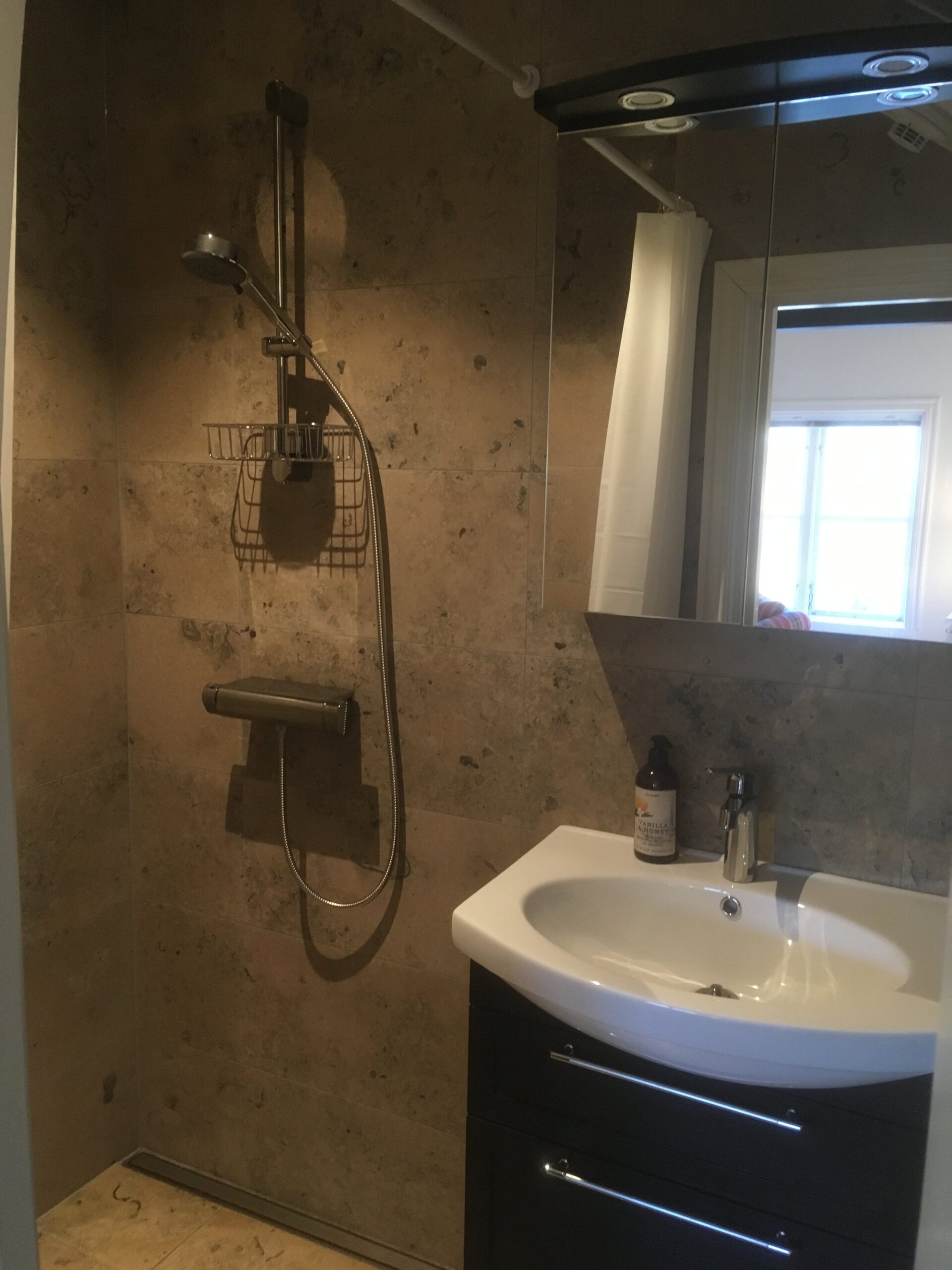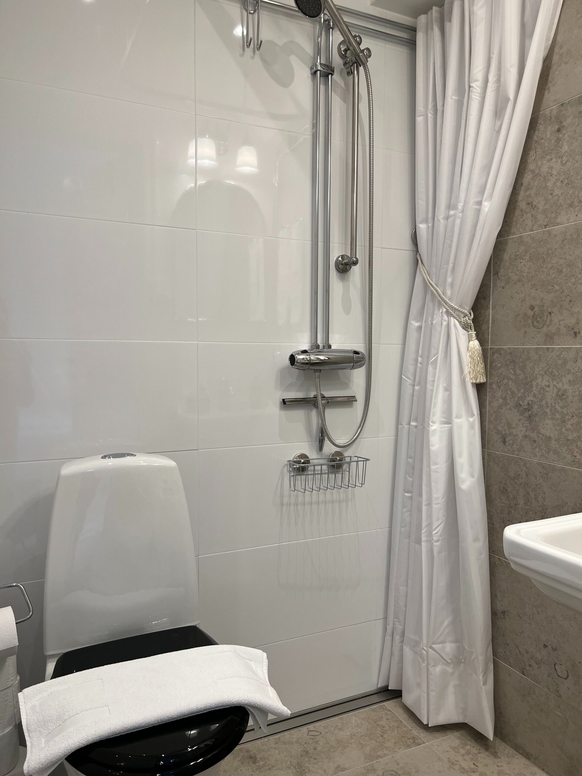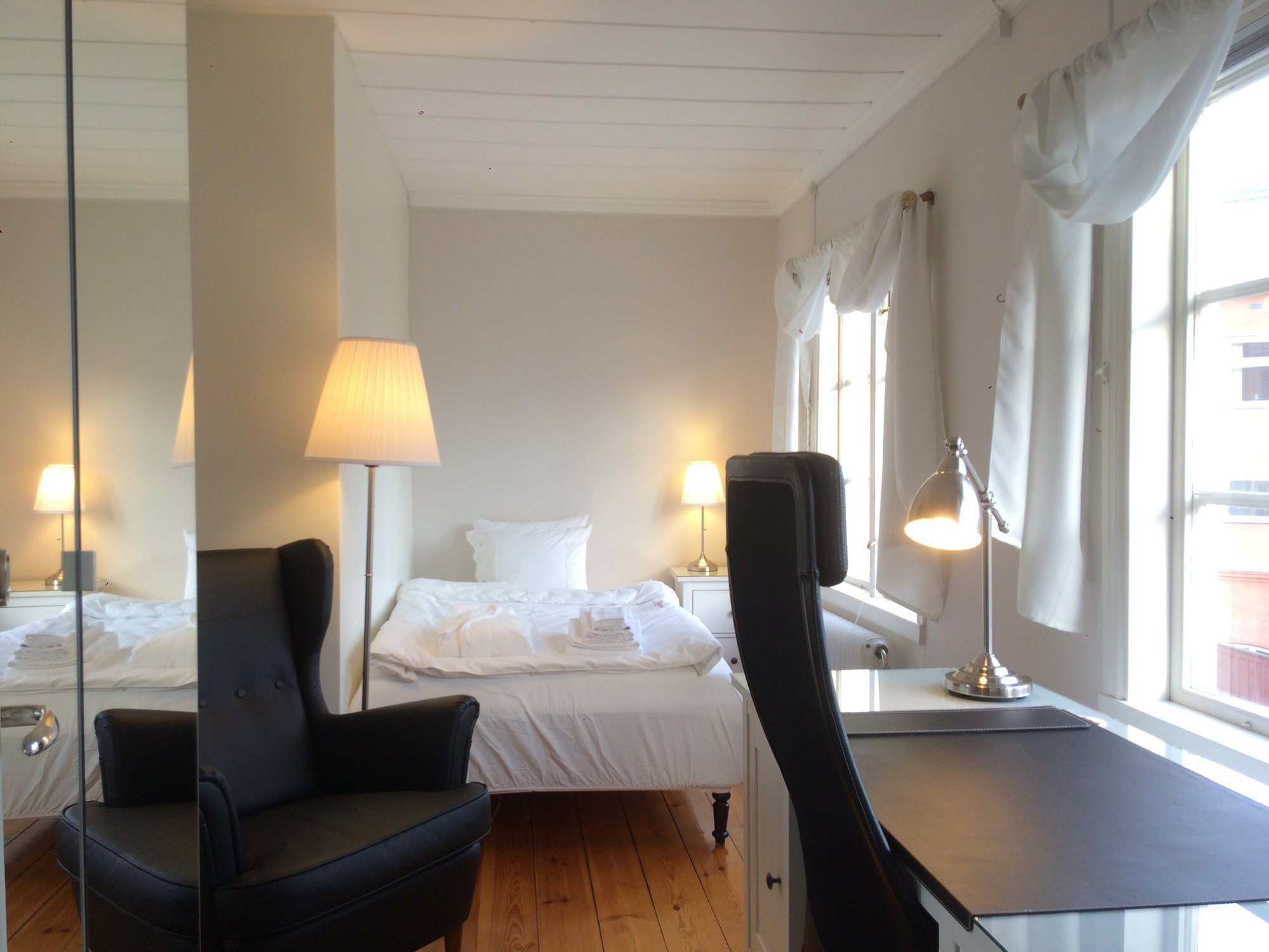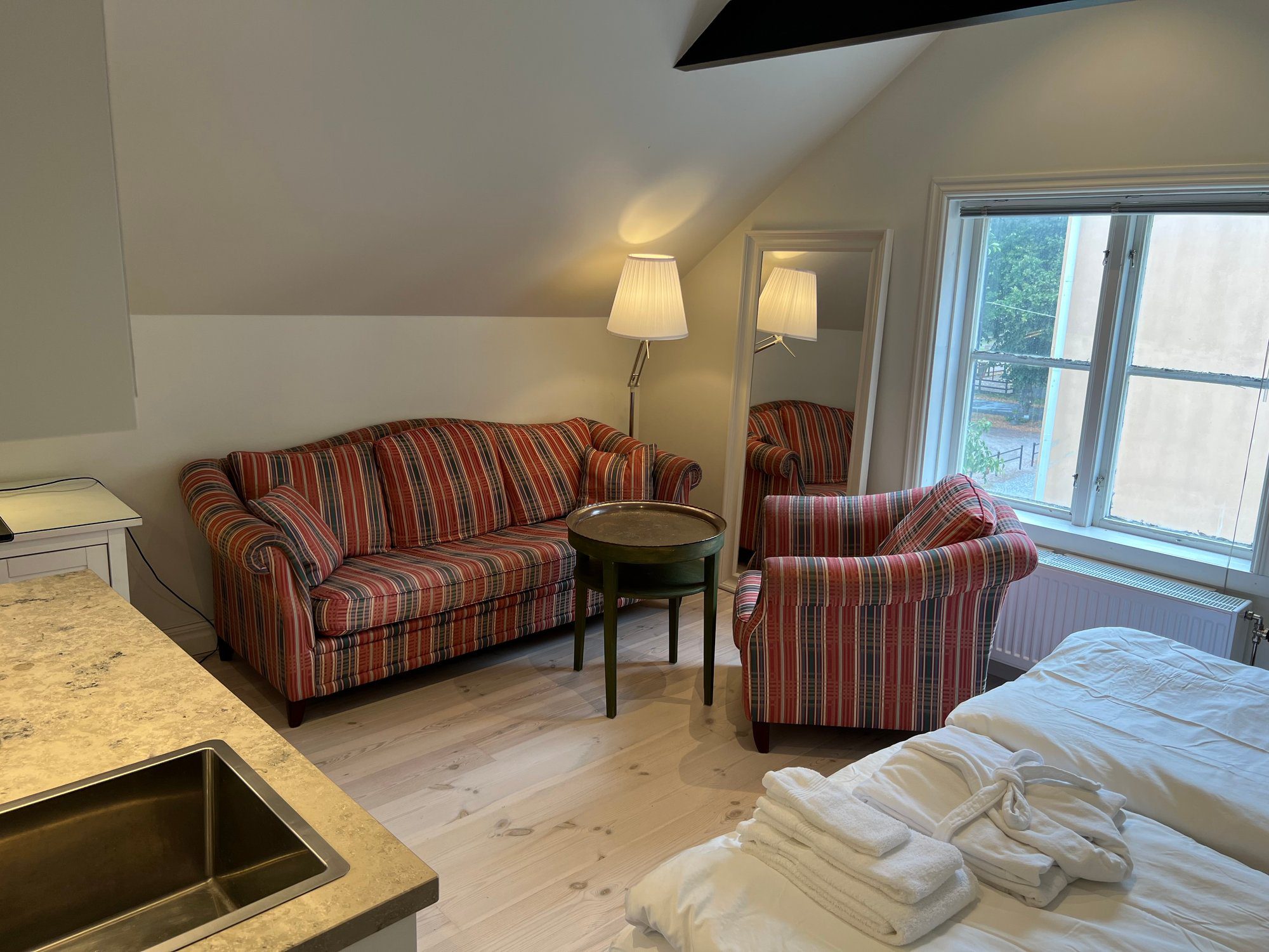 The large singles are 18 m² with a shared bathroom and a view of the Nyköping River. Each unit is furnished with a 120 cm bed, workspace, sofa, and wardrobe. Beds come with linens, an extra set, towels, and a bathrobe. Tenants have their own storage in the shared kitchen, including fridge, freezer, and cupboard space, and follow a weekly schedule for kitchen waste.