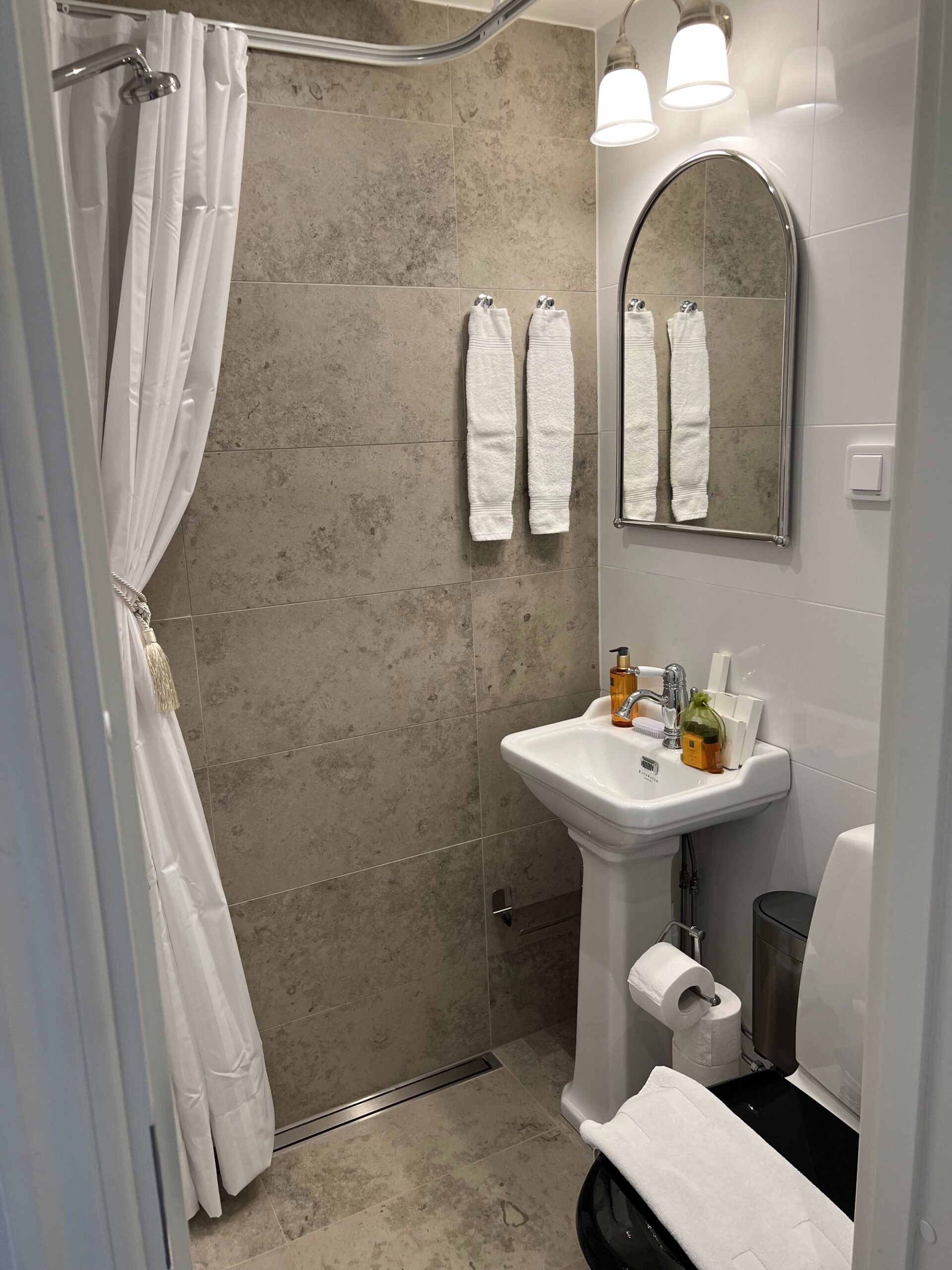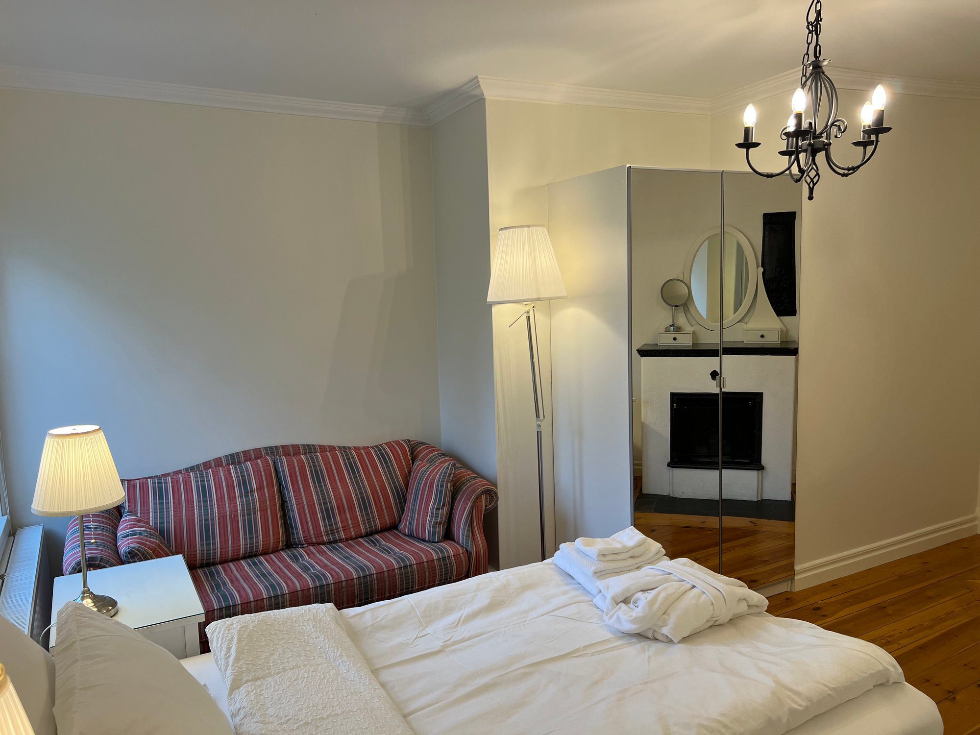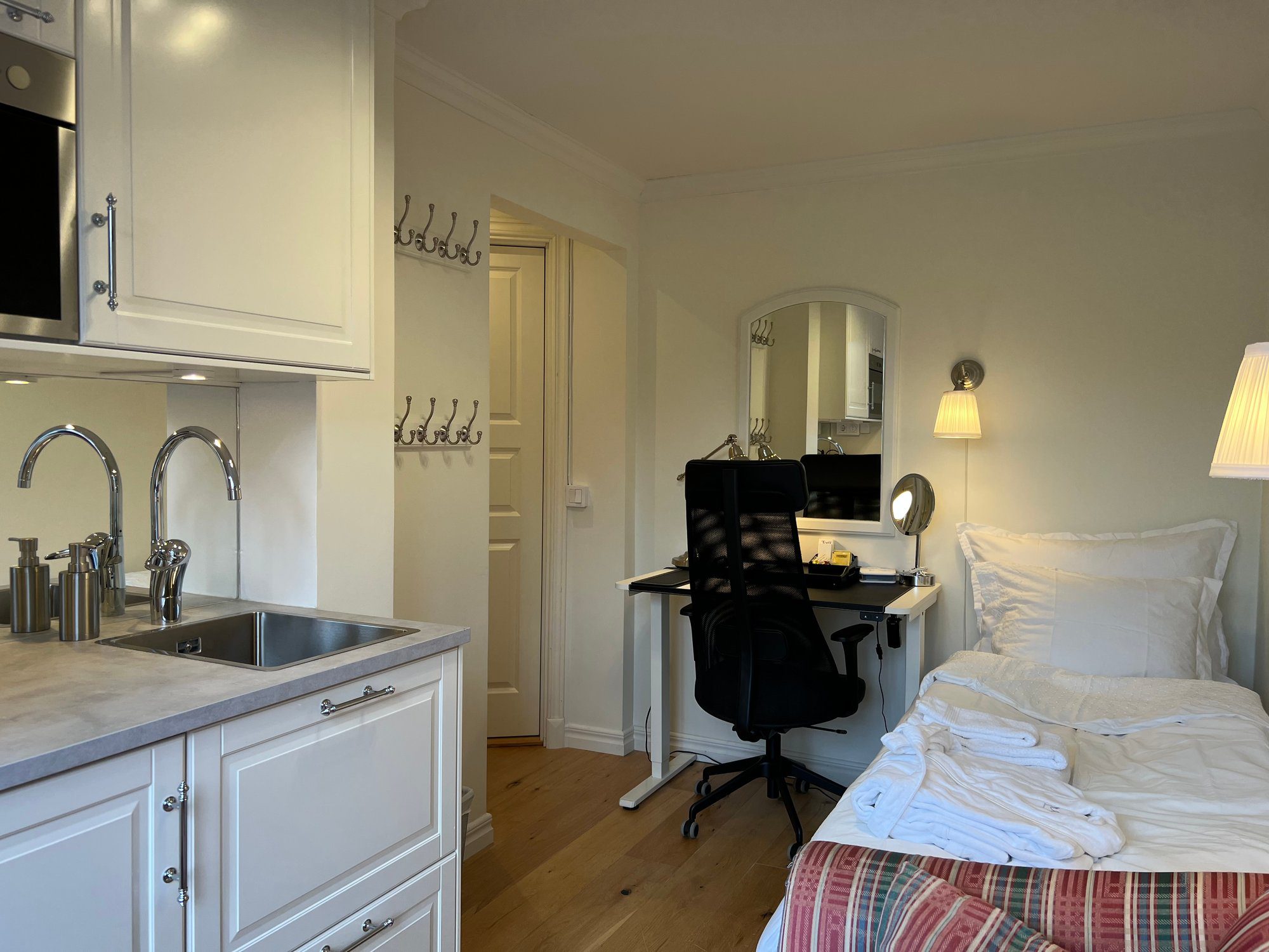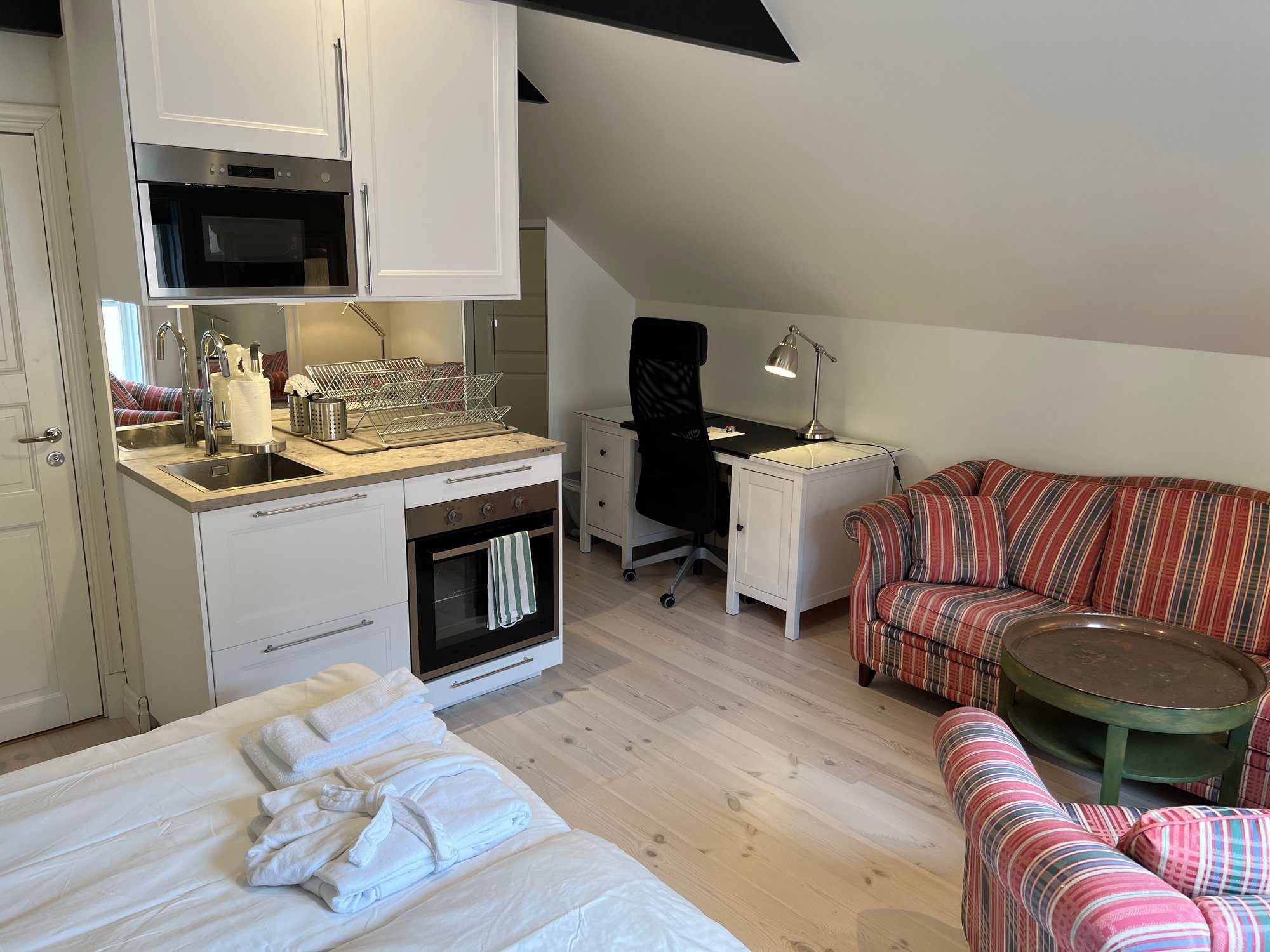 Each studio apartment is 12–13 m² and comes with its own private bathroom and mini kitchen. Every unit includes a 90 cm bed with fresh linens and an extra set in the wardrobe, a workspace, armchair, and wardrobe for storage. Towels and bathrobes are also provided.