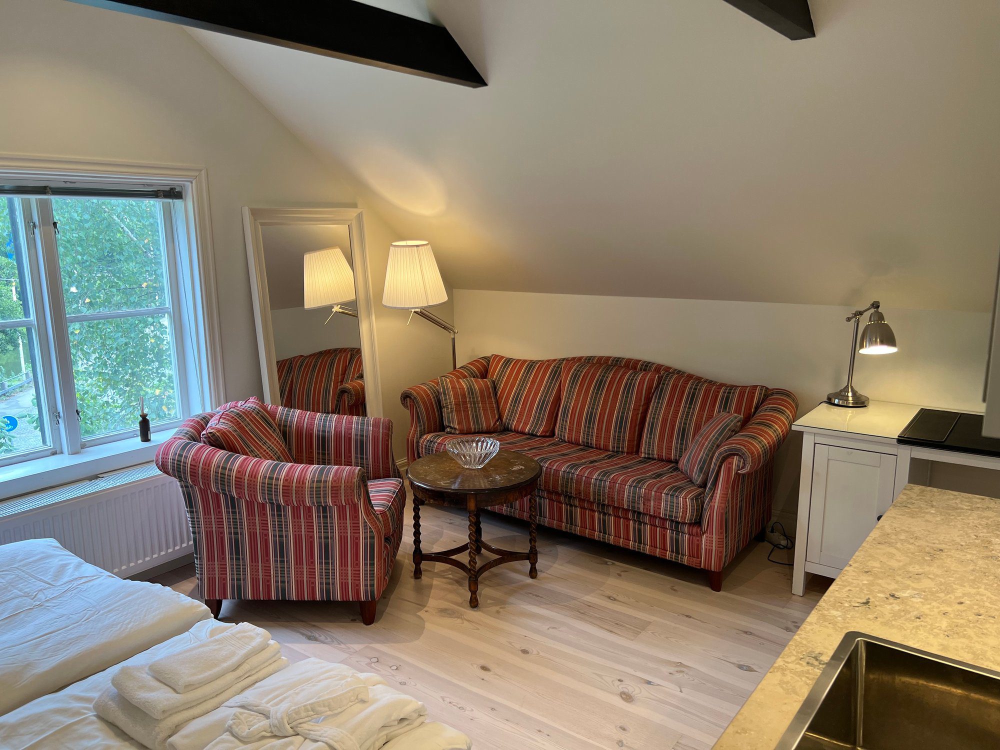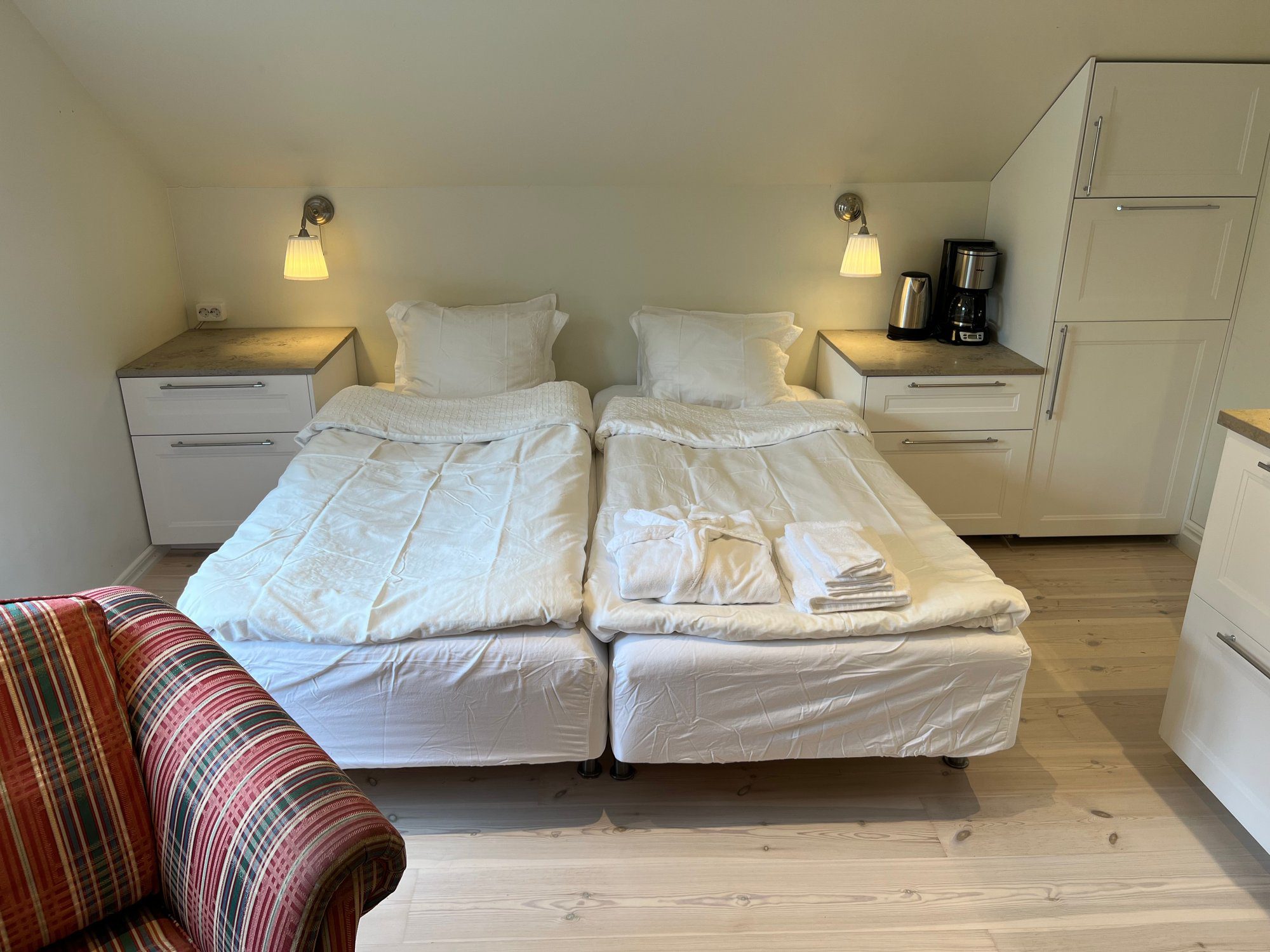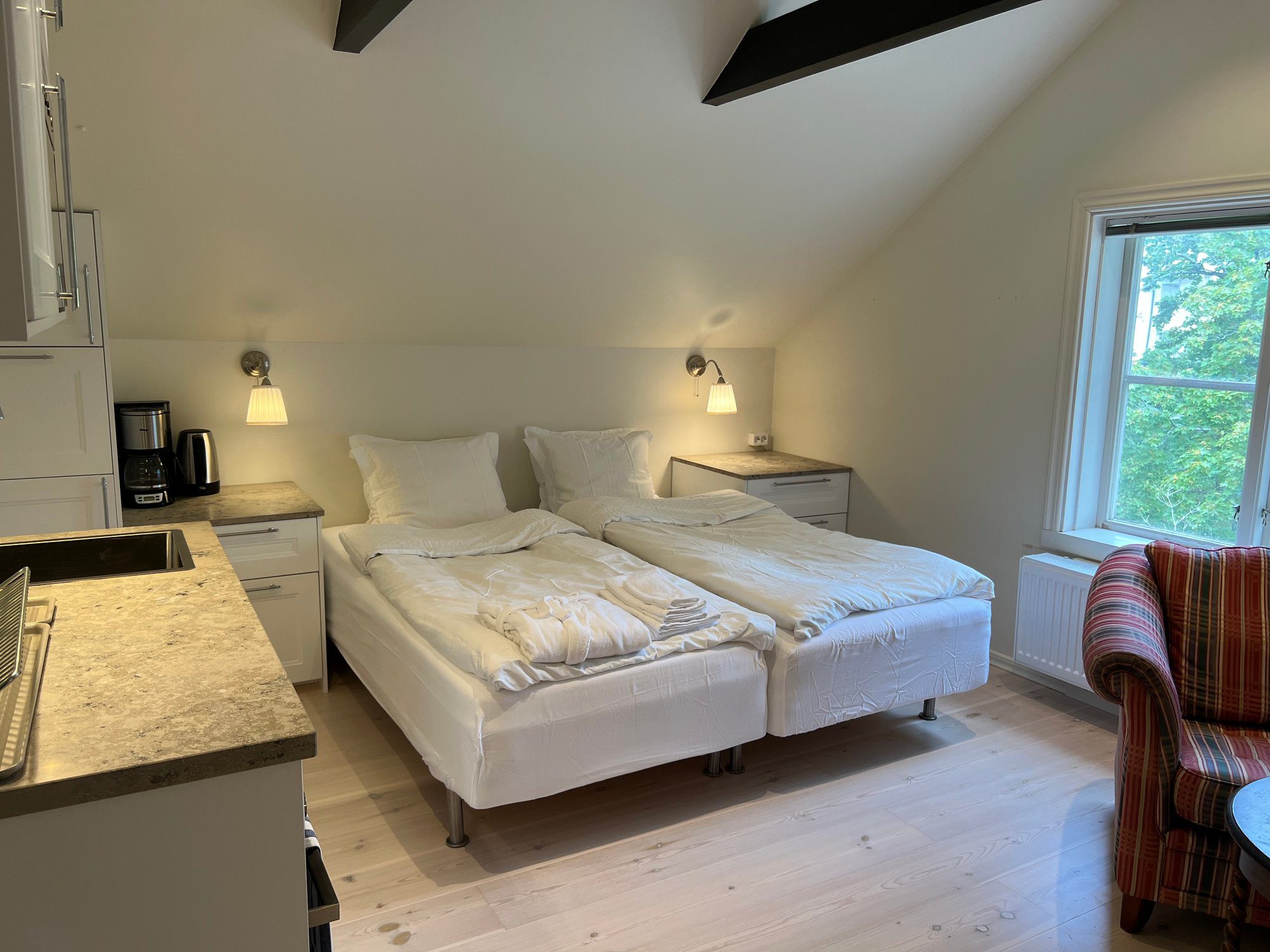 Each bright attic apartment spans 24 m² (30 m² floor area) and includes its own private limestone bathroom and fully equipped kitchen. Every unit features a double bed (two 90 cm beds), a dedicated work area, a cozy armchair, spacious wardrobes, and a comfortable sofa seating area. Beds are prepared with fresh linens, and an extra set is provided in the wardrobe. Towels and bathrobes are also included for your convenience.