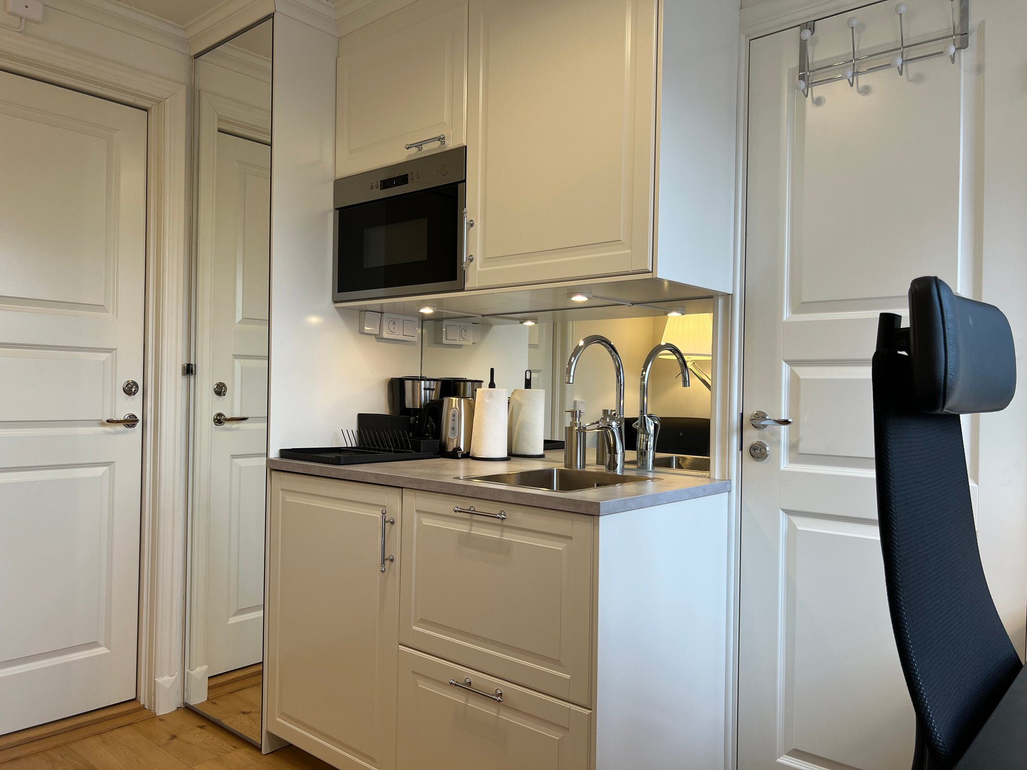 The private mini kitchen is equipped with a fridge with freezer, microwave, kettle, coffee makers, toaster, egg cooker, blender, and basic kitchen utensils.